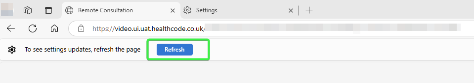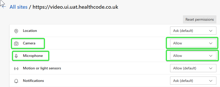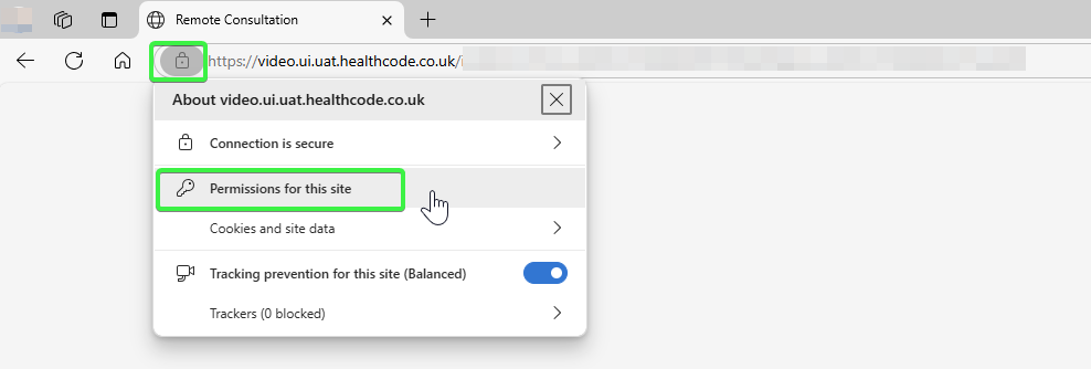 Whilst on the video consultation page (not this help page!) click the “View site information” icon to the left of the website address (usually a padlock icon) then click “Permissions for this site“